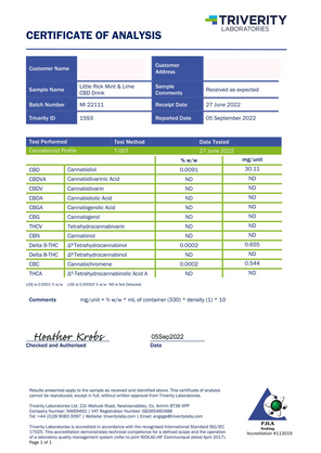 Ingredients: Sparkling water, British beet sugar, 6% lime juice from concentrate, natural mint flavour with other natural flavourings, sweetener: steviol glycosides, stabiliser, gum arabic, antioxidant: ascorbic acid, cannabinoids: CBD (cannabidiol), CBG (cannabigerol), CBC (cannabichromene). THC content<0.2%