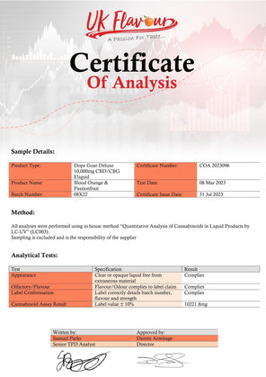 From the producers of the amazing Dope Goat Drip CBD E-liquids comes the Dope Goat Deluxe range, a premium mix of CBD & CBG isolate e-liquids coming at a whopping 10,000mg (5000mg CBD and 5000mg CBG) strength. With 5 flavours, each available inside 250ml sized bottles, vapers will experience the superb tastes of Dope Goat's Deluxe range mixed at 70VG/30PG ideal for Sub-Ohm vaping pods and kits.