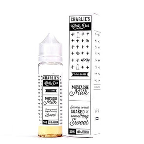 Charlies Chalk Dust Mustache Milk comes bottled into a 60ml capacity chubby gorilla bottle and contains 50ml of 0mg nicotine e-liquid. That leaves a 10ml empty space for adding a nic shot of your desired strength. Adding 1x 18mg Nicotine shot will result into 60ml of 3mg strength vaping e-liquid.