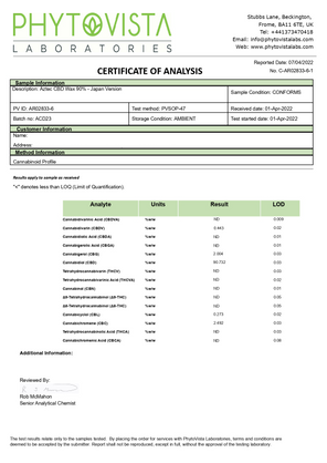 Broad Spectrum (THC Free) CBD wax/crumble Rich in terpenes. This extract is perfect for dabbing/vaporising with amazing flavour profiles. Stored in a glass container with a screwed plastic cap for easy use.