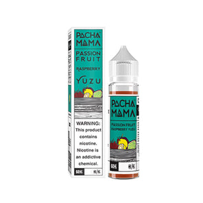 The Pacha Mama Passion Fruit Raspberry Yuzu Eliquid 50ml Shortfill bottle features an intense passionfruit and raspberry inhale with sweet notes, complemented by a citrus yuzu fruity for a crisp finish.